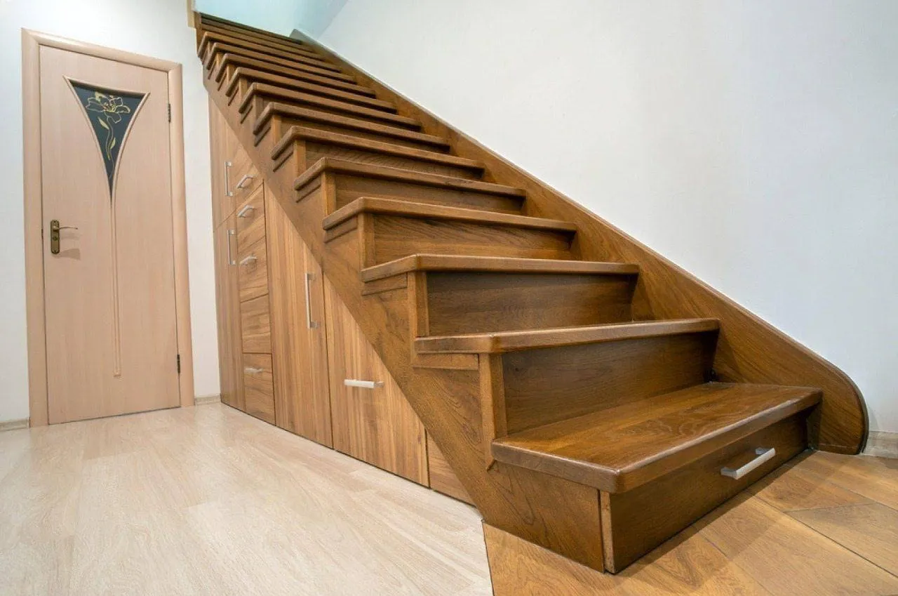1. Преобразим вашу прямую лестницу, отделав ее массивом дуба, ясеня или бука. Подберем оттенок и фактуру дерева, которые идеально дополнят ваш интерьер и создадут ощущение уюта.